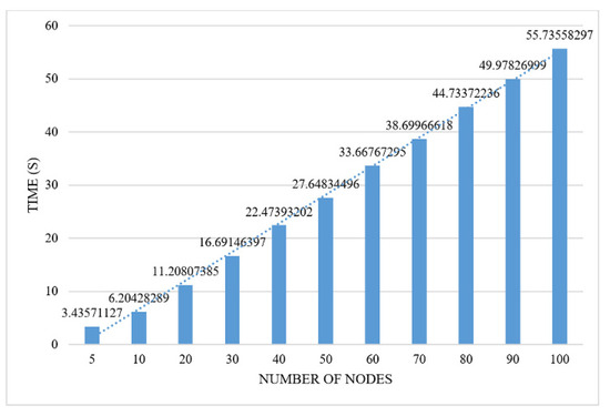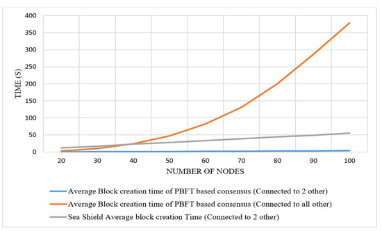 We developed a simulation environment for the Sea Shield with two numbers of connections, where every node is connected to two or more nodes to send or receive messages. We also observed that the number of connections affects the total block creation time of PBFT consensus during simulation. We compared the PBFT-based consensus with two connections and the PBFT-based consensus with connected to all other nodes. Figure 23 shows the block creation time of PBFT-based consensus with a different number of connections. The Sea Shield took 11.70170633 s to create an average block on 20 nodes with two connections while other PBFT-based consensus took 0.302378774 s with two connections and 3.014170098 s when connected to all on 20 nodes. The Sea Shield took a little more time in seconds than the other PBFT-based consensus.