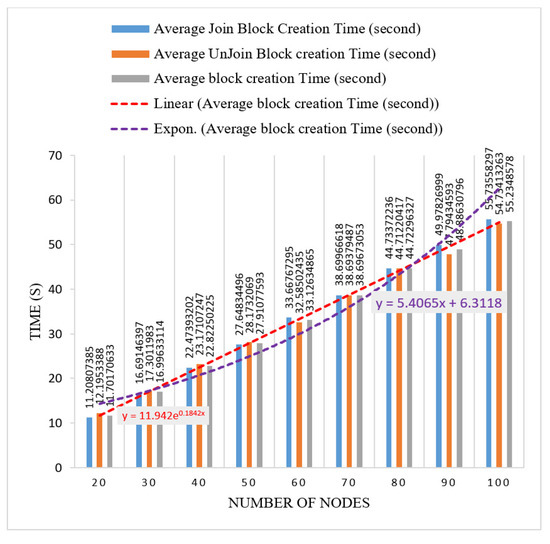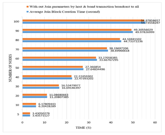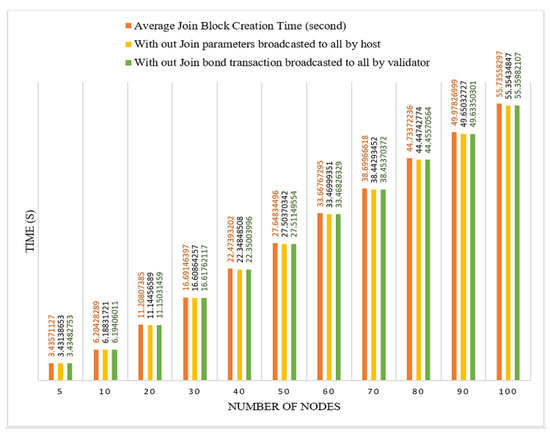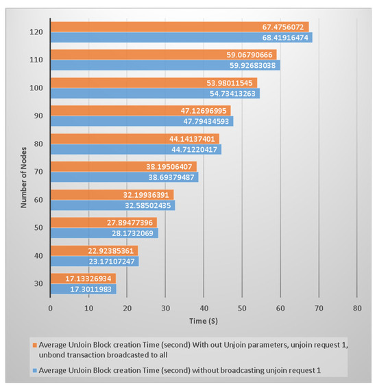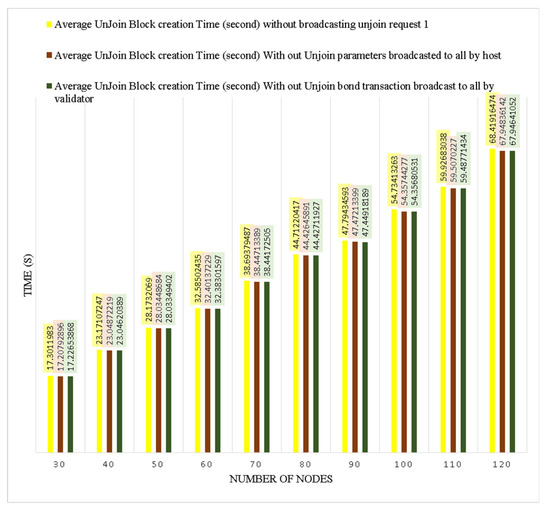 The Sea Shield average unjoin block creation time without broadcasting unjoin request 1 compared with the average unjoin block creation time without broadcasting unjoin parameters by host to all, and without broadcasting unjoin bond transaction to all by unjoin request node with respect to number of nodes.