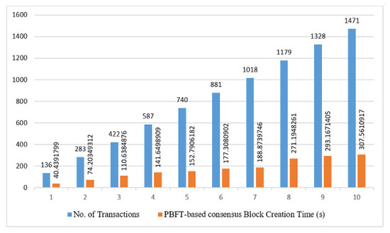 The PBFT-based consensus block creation time with different numbers of transactions.