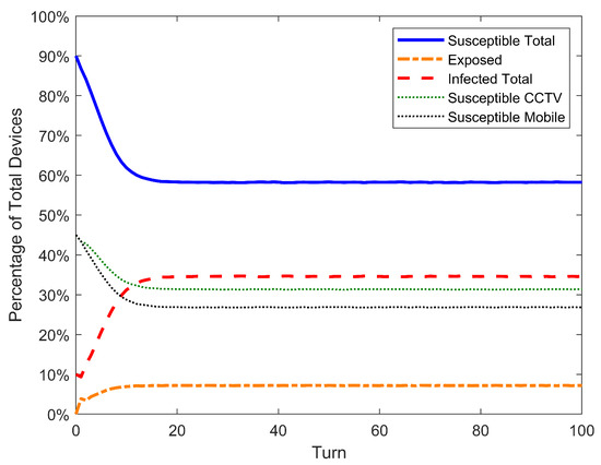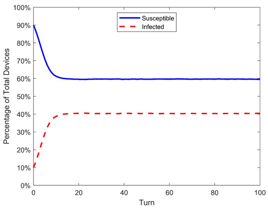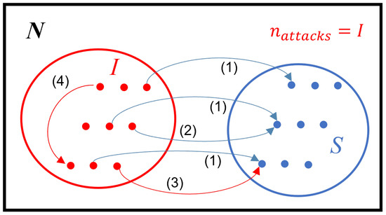 After all attacks of the current turn are performed, the newly infected devices will be moved from S to I to compose and . If there is no mitigation, is given by Equation (14):