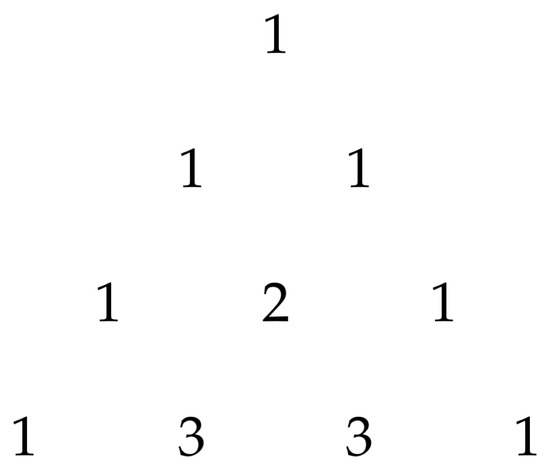 Expanding these series for (more than three attacks) becomes burdensome and yields increasingly big expressions. To deduce a simplified expression for any k, we expanded Equations (18)–(21) for each k from 0 to 3 and looked for mathematical patterns. The calculations are shown in Table 3. The table is divided into five vertical sections: the top section shows the recursive formulas with respect to k, while the second to bottom sections show the resulting expressions from to . Each section is further divided into three subtables: top-left is the subtable containing the expression for the Evolution of Populations; below it is the subtable containing the Target Probabilities; and the top-right is the subtable containing the Population Size After Attack. Table 3 takes us into every step necessary to calculate the desired Population Size After Attack. As Equations (18)–(21) indicate, we multiply the Target Probabilities by Evolutions of Populations (j by j, from 1 to 4), and sum the four multiplications to find its Population Size. Looking at the Population Size of all canonical states for (last column, marked in yellow), it can be seen that after every attack, a new term was added to the Population Size. Checking the coefficients of , , , and , we find they are, respectively, the same as the elements of Rows 1, 2, 3, and 4 of the extended Pascal triangle (which has the same elements as Pascal’s triangle but with consecutive elements alternating between positive and negative values). Figure 3 shows the first four rows of Pascal’s triangle, while Figure 4 shows the same for the extended Pascal triangle
