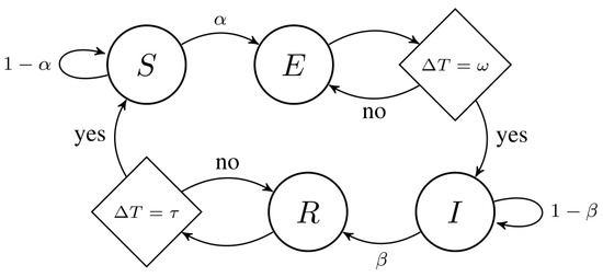 The compartmental model SEIRS is a popular template used in many studies with specific modifications to the modeled network [25,26,31]. It presents a delay mechanism in both infection and mitigation. After being infected, devices are first brought to a state of temporary incubation (called exposed and represented by E), where they remain asymptomatic for some turns and do not replicate the infection. After being cleaned, devices are brought to a state of temporary immunity (called recovered and represented by R) and cannot be infected again for some turns. In most models, devices stay in E and R for a fixed number of turns and then finish transitioning to the final state. E takes turns to transition to I, while R takes turns to transition to S. Its states are four: