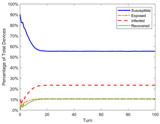 To nullify the variability of the stochastic simulation, a network model of IoT devices was used, at which size the variability of our random tests decreases to ∼0.1%. The network is isolated from external interactions, and the simulations start with a percentage of devices already infected from the beginning, which then propagate the malware to other devices. This initial percentage of infections is in all simulations.