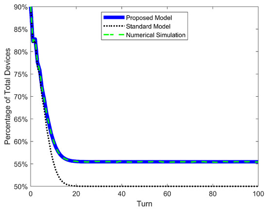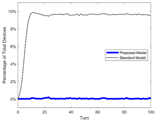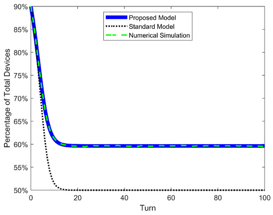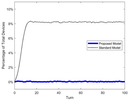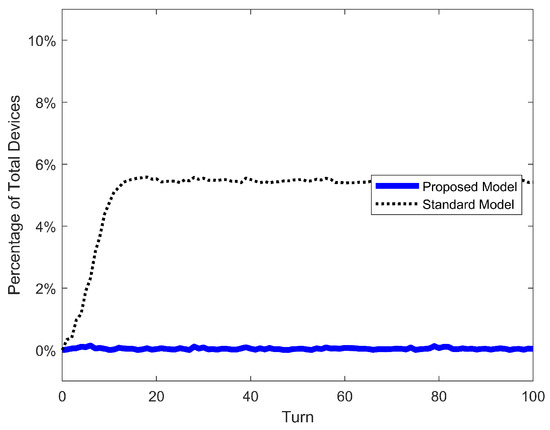 In order to demonstrate the validity of our model and compare its performance with the main model of literature, we developed a stochastic simulation that performs infections and mitigation actions device by device. Setting the same parameters for the Markov chain models and the simulation, the results of the Markov chain and the simulation were generated independently and compared. The simulation results are independent of the Markov chain because Equations (51a)–(53e) represent the epidemic states of entire populations of devices without keeping track of the state of individual devices. The simulation, however, stores the state of every device. Moreover, the infection and detection rates behave as deterministic parameters in the equation, but in the simulation, they are real random tests performed at every attempt of infection and cleaning. By running the simulation against a sufficiently big population, the stochastic variability of the simulation is minimized, and a fair, independent comparison becomes possible. The simulation code is available on a public GitHub repository (link at the end of the paper).
