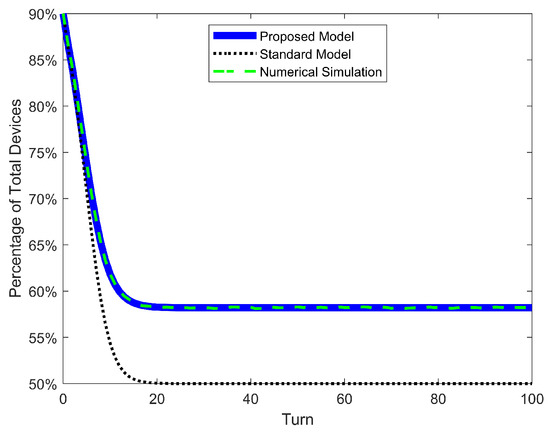 of our proposed model, however, depends not only on but also on the binomial (Equation (57)). Together with the numerical simulation, this mathematical result points to the overestimation of malware propagation in the standard model.