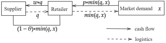 A supply chains with a single manufacturer and a single retailer is the typical setting in previous studies, in which the retailer faces random demand with a cumulative distribution function and an exogenous retail price, and a supply contract between the manufacturer and the retailer determines the transfer payments, such as the wholesale price. The retailer decides on the order quantity q, and the manufacturer decides on the wholesale price w [,,]. The signing of supply chain contracts for both parties aligns their goals with the profit maximization of the supply chain system to avoid an uncoordinated situation; adjusting the contract parameters can improve the profits and system efficiency of all participants [].