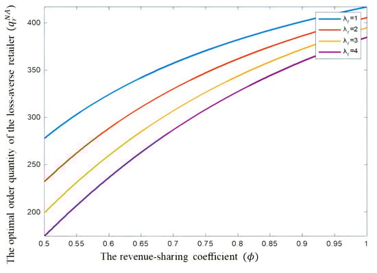 Proposition 4 indicates that revenue-sharing contracts can still coordinate the supply chain when both suppliers and retailers are loss-averse. When the loss aversion factor is relatively high, the optimal order quantity decreases with the revenue-sharing coefficient.
