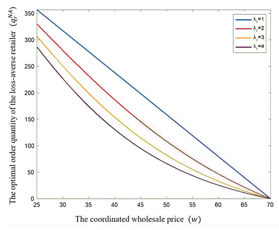 According to parameter constraints, assuming that the profit-sharing coefficient is the same in all four scenarios, the optimal wholesale price w for supply chain system suppliers with all members considering loss avoidance factors can be obtained as , In other words, is always valid. When , we can obtain . When , we can obtain . The optimal order quantity for the four scenarios is