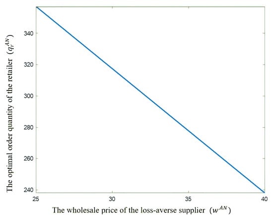 From Proposition 3, under the AN scenario, the revenue-sharing contract still can coordinate the supply chain. The loss-averse supplier conveys their loss aversion to the supply chain by offering a higher wholesale price than the coordinated wholesale price in the benchmark model. This leads to a reduction in the order quantity. This means that under contract coordination, the supplier undertakes the risk with the retailer due to upstream raw material instability or market risk being weakened, leading the retailer to reduce their order quantity to protect their profit.