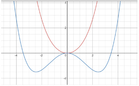 This is a well-understood potential term in the research area of Quantum Field Theory [7,8]. In this part of the paper, we will not take into account the different classes because when the symmetry is broken, the distinction between classes is completely lost. Then, we will omit the subindex i from Equation (20) for the subsequent analysis. The potential (21) is a function where some combinations of the parameters and create the ideal scenario for reproducing spontaneous symmetry breaking after a small fluctuation affects the system [13,14,15,16,17,18,19]. Here we will interpret this symmetry breaking pattern in the language of the RM problem. We will also understand how the phase space is deformed due to the presence of the additional potential term . The form of the potential (21) can be illustrated in Figure 2.