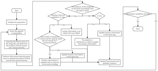 Step 4: If the distance from the dragonfly to the food source is longer than the search radius r, there are adjacent individuals, there are more than 5 iterations and the optimal value has not changed for five consecutive iterations, the sine cosine strategy is executed to update the position information according to Equation (21). If the distance from the dragonfly to the food source is longer than the search radius r and the dragonfly has no adjacent individuals, then Levy flight is performed to update the position information according to Equation (17). If the distance from the dragonfly to the food source is not longer than the search radius r and , the adaptive t-distribution is performed to update the position information according to Equation (22); otherwise, update the position information according to Equation (16).