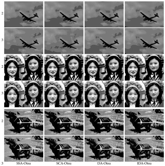 As can be seen from Table 3, when the maximum between-class variance function is taken as the objective function, the PSNR value and SSIM value obtained by using IDA-Otsu algorithm for image multi-threshold segmentation are far better than those obtained by the other three algorithms. When the PSNR value is used as the evaluation index, the IDA-Otsu algorithm performs best in both the double threshold and the triple threshold of Figure 5d,f. The IDA-Otsu algorithm has the highest PSNR value in the double thresholds in Figure 5a, and increases the PSNR value by on the basis of the original DA algorithm, although the PSNR value of the three thresholds in Figure 5a is not the highest, but the PSNR value of the IDA-Otsu algorithm is higher than that of the SCA-Otsu algorithm and the DA-Otsu algorithm. The PSNR values of the IDA-Otsu algorithm in Figure 5b,c,e are the best in the three thresholds, in which the PSNR values obtained by the IDA-Otsu algorithm in Figure 5b,c are slightly inferior to the PSNR values of the SCA-Otsu algorithm in the two thresholds, while the PSNR values obtained by the IDA-Otsu algorithm in Figure 5e are slightly inferior to the PSNR values of the SSA-Otsu algorithm in the two thresholds.