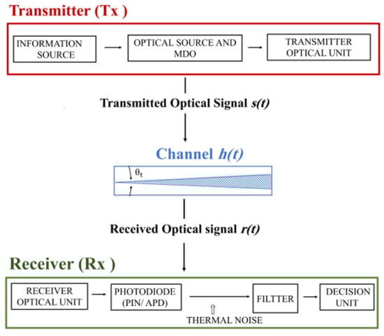 While the authors in [,,,,,,] used CB to conclude the receiver functional ψ, we use a new Rx model to create the ψ based on an MGF, which describes rf(t). This model includes ropt(t) as an input, rf(t) as output, and FD as a selection reference value. Hence, the central MGF can be used by considering FD as a reference value for λ(t) defined in Equation (6). However, the statistical entities MGF or LMGF can be used to describe the system’s attributes, structures, and the connected sequence of underlying processes.