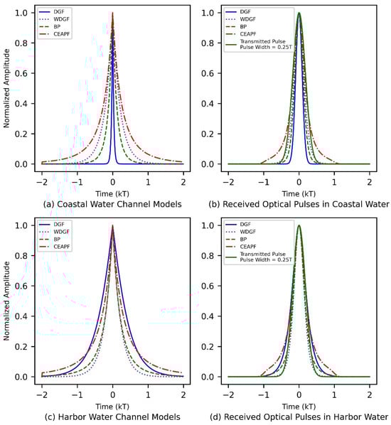 The computation in this paper considers the propagation channel impulse response based on the DGF model only. The reason behind such a step can be justified as follows: the channel models’ data visualisation in Figure 2 for Coastal and Harbor seawaters helps shed more light on the justification of using just the DGF channel model. Figure 2a,c show the channel models for Coastal and Harbor waters, respectively. From these figures, it is easy to notice that all seawater channel models have the same temporal profile, practically a DGF profile, but with different temporal broadenings (i.e., different frequency bandwidths). To support this observation, we can use the statistical techniques of transforming the random variable [21–Chapter 2] on the WDGF, CEAPF, and BP to produce the DGF distribution.