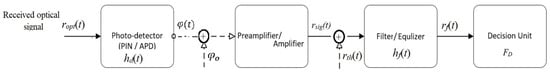 It is helpful to state that the optical signal (bit stream) is converted into the electrical domain at the photodetector output, which represents the current due to the shot noise and Additive Gaussian Thermal Noise (AGTN) originating from pre-amplifier and amplifier at the detector backend. These electronic components are added to form the input to the electronic filter hf(t) (Figure 3), which acts as a pulse-shaping unit whose optimum bandwidth needs to be concluded []. The last task is the main objective of this paper.