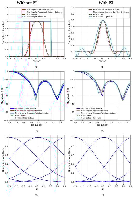 Second, regarding optimisation criteria, the CB and MCB optimization in [,,,,,,] is based on minimizing the BER for the decision unit. Our model’s optimization is based on directly maximizing the received processed signal energy presence around the pulse center to elevate the signal-to-noise ratio (SNR) at decision time. The two approaches are essentially the same due to the probability of error association with SNR through the error function (ERF). The outcome SNR is shown in the eye diagram of each use case’s optimum filter out rf.