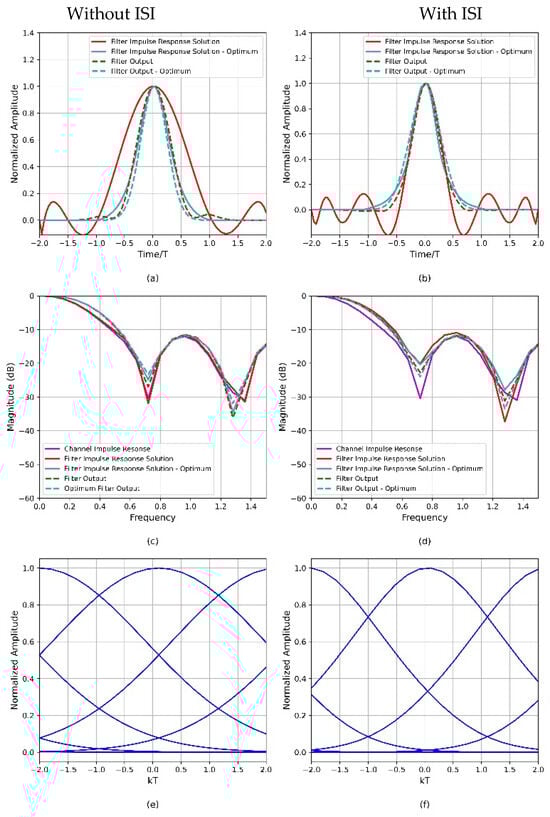 Our new MGF design modelling approach preserves the limits between the general solution and optimum space due to the J optimization. So, their undershoots, depths, and variations are different rather than uniform for CB and MCB filters [,]. Also, it is worth noting that the analytical solution of use case II for the white AGTN noise exhibits undershoot when including ISI. Such behavior indicates that the undershoot is an intrinsic behavior of the solution rather than curve interpolation by the curve fitting library. Here, we do not mean that the numerical solution will not be subjected to changes due to possible higher fitting polynomial values.