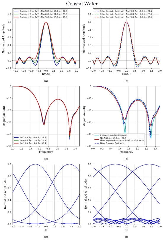 Figure 6 shows the numerical computation outcome of use case III for Coastal water, which only includes the ISI scenario alongside the colored AGTN. Figure 6a shows a set of three optimum solutions of hf of Equation (22) for different {N0, a0, a1} value sets. The undershoot decreases with N0, because the AGTN is an additive element to the ISI signal component. However, this does not impact the filter bandwidth, as shown in (6c). This is one of the indications that the filter hf is doing equalization. The corresponding outputs rf in Figure 6b mirror the exact behavior of hf. Figure 6f shows the limited impact on the eye-opening compared to Figure 6e, which exhibits the eye diagram of the transmitted optical pulse ht. Hence, Figure 6f shows the filter’s compelling performance in combating the ISI, which is partly a footprint of the scattering and scintillation impairments.