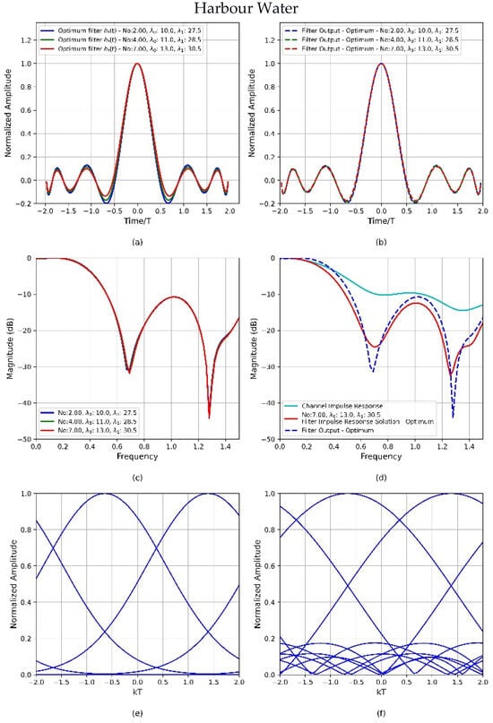 When comparing our proposed optimum filter with the raised cosine filter (RCF), which is a reference industry standard, it is essential to mention that RCF access bandwidth (BW) is proportional to the roll-off factor (β). This means that we need a lower β at the run time to reduce the access BW. This reduction in β could mean less ability for the filter to reduce the ISI at high and moderate bit rates. At a low bit rate, the RCF is fine. This is inherently linked to the RCF’s undershoot cycles being tied up to the bit period boundaries, causing unnecessary higher flooring in the eye diagram. Our optimum filter for ISI use-cases shown in Figure 4f and Figure 5f for Coastal, Figure 6f and Figure 7f for Harbour, shows practically no floor for the Coastal scenarios and limited floor depth for the Harbour scenarios. The reason behind this is that for the corresponding ISI use cases in Figure 4b, Figure 5b, Figure 6b and Figure 7b, we can notice that the undershoot cycle crossing is not tied up to the bit boundaries like the RCF. Such behavior means our proposed filter is optimized when necessary and is not fixed to fixed bit boundaries.