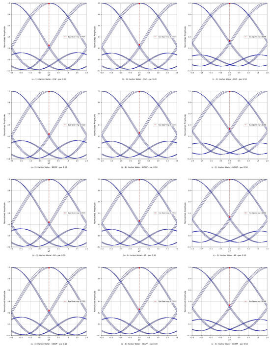 One of the techniques to measure the system performance is provided by the extent of the eye-opening (Oeye) in the eye diagram, which is typically affected by the dispersive and nonlinear effects accumulated inside the propagation channel []. Hence, to further examine the performance of the optimum filter unit hf, which is the solution of Equation (22), we used four water channel models of hc {DGF, WDGF, BP, CEAPF} shown in Figure 2, at different transmitted pw values of ht {0.1, 0.3, 0.5} to produce the eye diagrams of the rf, which is the output of the optimum filter hf (see Figure 3). The assessment indicator of the rf eye diagrams is based on the Oeye which is marked in red in Figure 8 (for Coastal water) and Figure 9 (for Harbor water). The importance of Oeye is that its value is proportional to the Q-Factor. The Q-Factor determines the BER of the receiver system [,,,,].