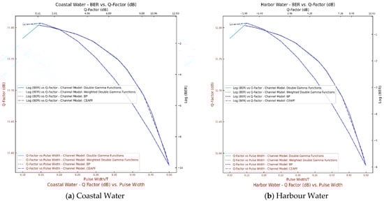 shows the BER performance at the optical receiver system level, and the optimum filter hf is part of it. Figure 10a is for Coastal water, and Figure 10b is for Harbor water. It is easy to observe that using the same transmitted power across different transmitted pw values, the Q-Factor decreases in the same manner that BER declines (i.e., better performance) with increasing power.