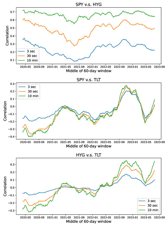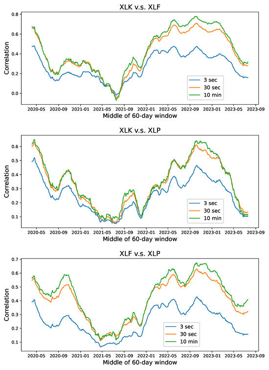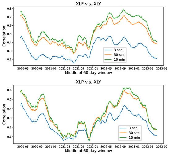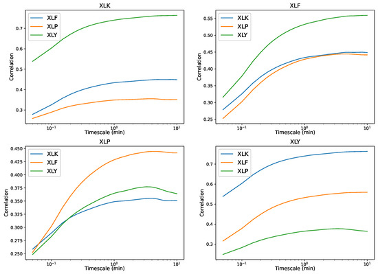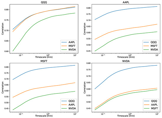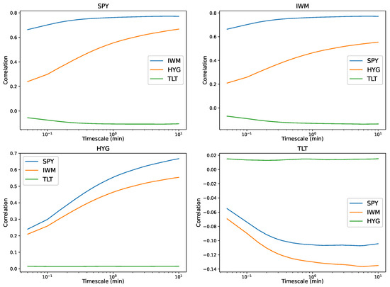 Definition 1. Let the pair of log prices and be stationary processes on . For , the multiscale covariance between X and Y is defined asIn turn, their multiscale correlation is defined as Although there is no restriction on the form of the function, the multiscale correlation behavior is limited for a wide class of processes.