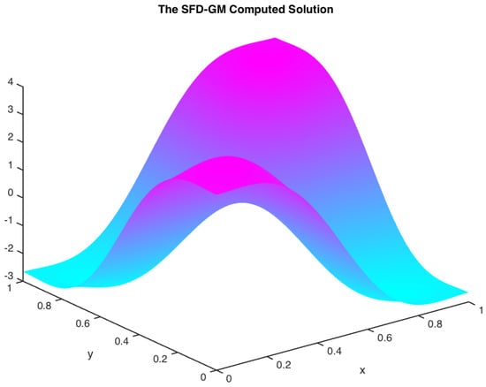This section is devoted to conducting numerical experiments to justify our proposed theory. To this end, we used Matlab 7.100 software (R2014a). With this framework, we constructed algorithms from the NSFD-GM scheme, wrote approximate codes, and used the software above to run the codes for the numerical solution from the scheme. The aforementioned experiments were carried out over the domain , where is discretized into a regular mesh . The discretized structure of the regular mesh is of size h in the space variables and in the time variables. This discretization of both the space and the time domain leads to the computation of the numerical solution of the problem (1)–(3). This is achieved by considering the maximum value of and . The above scheme is implemented by considering the complicated function to be in such a way that and , where M denotes the number of triangles in the discretization. With this framework in place, the iteration process proceeds by first considering the following exact solution:
