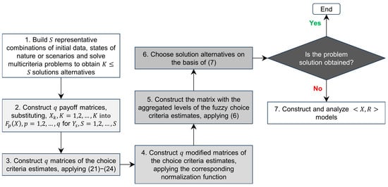 In addition, the consideration of models and models can serve as parts of a general scheme of multi-criteria decision in the conditions of uncertainty, which is the main subject of the present work. This scheme is associated with the generalization of the classic approach to dealing with information uncertainty [14,15] to multi-criteria problems. It is based on analyzing special aggregations of payoff matrices [16]. Its important characteristic is to apply existing quantitative information to the highest degree to reduce decision uncertainty regions. If the problem-resolving capacity related to quantitative information processing does not permit one to obtain unique solutions, the general scheme presumes the use of qualitative information based on knowledge, experience, and intuition of involved experts.
