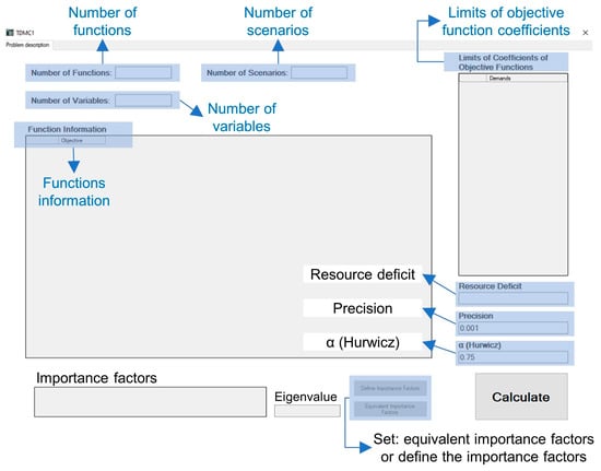 The uncertainty of the initial data is treated through the transformation of the objective functions presented in (1) and (2). It is essential to highlight that these transformations must consider the corresponding description of the importance coefficients. Although aggregation procedures allow one to construct meaningful combinations of initial information, scenarios, or states of nature, considering information of a deterministic, interval, probabilistic, or fuzzy character, in the present work, for simplicity, we use the interval description, which has found diverse applications. Considering this, the objective function (1) can be represented as