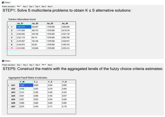 The matrix with the aggregated levels of the fuzzy choice criteria is obtained by applying the min operator. The results taken directly from the system of multi-criteria decision-making in uncertain conditions and that are presented in Figure 4 convincingly demonstrate that the problem’s solution is ΔX2 = {Δx1 = 1971.689; Δx2 = 360.733; Δx3 = 1976.000; Δx4 = 2618.578}.