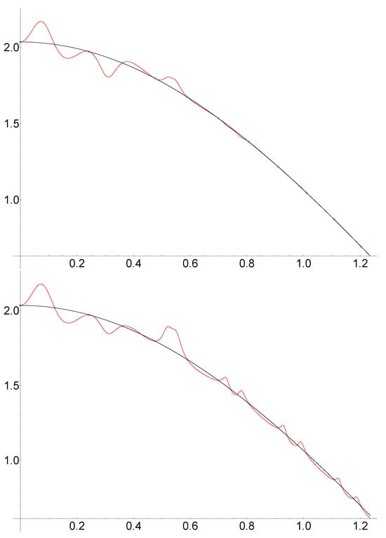 Our second example is included to show the convergence of the Hermite–Fejér interpolant and the interpolant , taking derivatives, and allowing us to satisfy the hypothesis of Proposition 4. We employ a nodal system with nodes and . The objective function is , a quite variable function near and (). In Figure 2 below, the function with , which is close to , is depicted in black. Furthermore, is depicted in red. We added the interpolation points in blue. Below, we represent, in a greater interval, and the function for . Near and , we take null values for the derivatives and far from both points, we use the derivatives of the function, allowing the hypothesis of Proposition 4 to be satisfied.