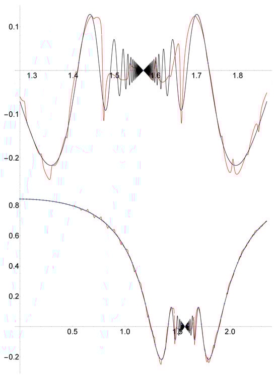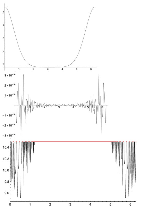 This example is considered to represent the convergence of corresponding to an analytical function on an open annulus containing . We use a nodal system with nodes and . The objective function is . In Figure 3, at the top, the function with is depicted in black and is depicted in red. The relevant fact is that both functions are indistinguishable. In the middle, we represent the difference between both functions to observe the accuracy. Finally, at the bottom, is represented in black when this value is less than or equal to , and in red for or in other cases; this gives a clear idea of the order of the error.