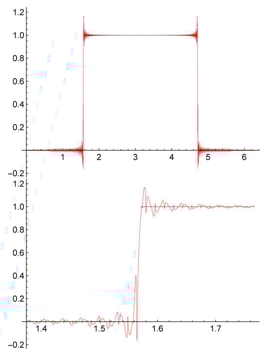 Above, representation of the jump function in black together with in red. Below, detail near one jump.