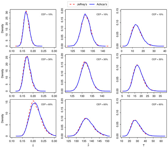 Also, Figure 1 shows the kernel density estimates of the parameters for Jeffrey’s and Achcar’s priors at 10%, 30%, and 60% censoring levels. The plots seem adequate and both methods seem to provide very similar estimates. However, as [26] indicated, the Gibbs output may not detect improper posteriors; the scale transformation we suggested should have scaled-down to prevent such possible divergences.