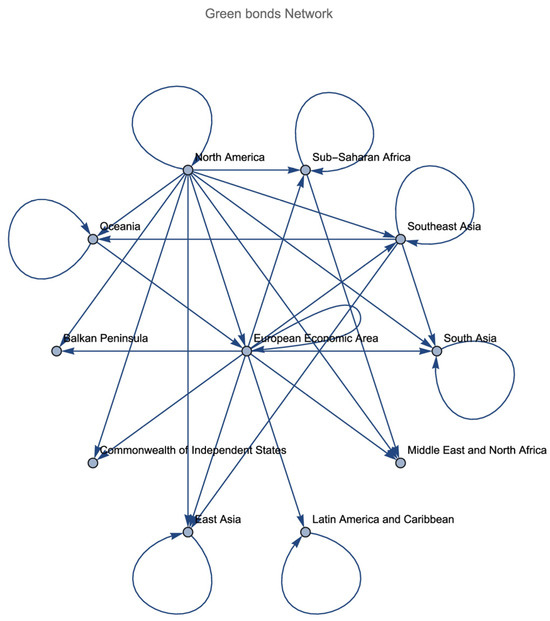 In the sections that follow, the network of relationships between market participants is set from information derived from the real-world data of [1]. In this financial network, nodes represent regions as counterparties, while edges represent the flow of green bond proceed allocations between pairs. An edge between two nodes exists if there is at least one transaction between the two counterparties. For each connected pair of nodes i and j, the edge is weighted with the gross mark to the market value of all transactions between the two nodes/counterparties. The arrows that represent the edges are directed from the allocator to the recipient region.