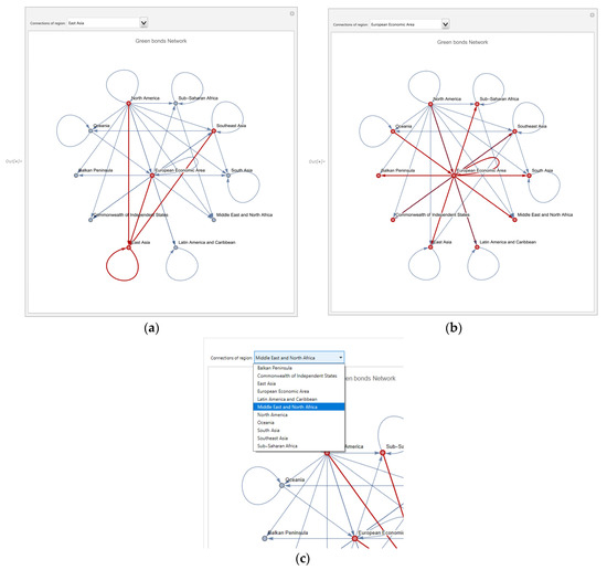 Connectivity of regions in the global green bond network. Connections are the transactions between regions. The connections of the selected region in the drop-down list are marked in red. (a) East Asia international transactions over 2006–2017 in the background of the global green bond transfer network; (b) European Economic Area international transactions over 2006–2017 in the background of the global green bond transfer network; (c) Manipulate control for the selected node.