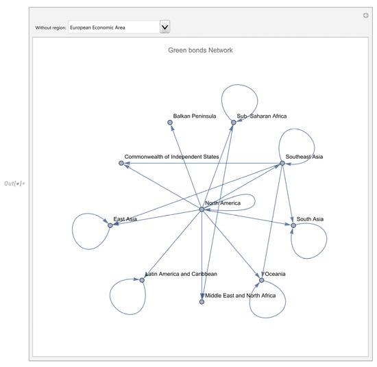 What if scenario analysis: the green bond network, excluding the European Economic Area. The excluded region is selected from a drop-down list at the top left corner of the output cell.
