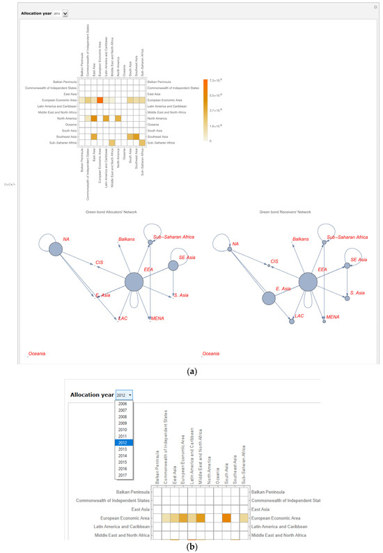 (a) Up: A heatmap illustrates the allocators (given in rows) and the receivers (given in columns) pattern for allocation proceeds. Dots in the color legend denote the decimal points. Down: The region-to-region green bond transfer network with a tooltip option for edge weights. In the green bond allocators’ network (left), node size is proportional to their strength-out. In the green bond receivers’ network (right), node size is proportional to their strength-in. (b) The allocation year is selected from a drop-down list at the top left corner of the output cell.