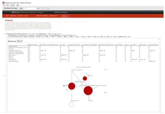 In business models, it is often useful to have interactive graph representations, with the chart input range responding to any changes in the graph simultaneously. This approach permits specific graphs to be displayed on request [2]. In this direction, we use the computer algebra system Wolfram Mathematica (v. 11.3 or later) to display practices, patterns, and roadmaps of the intercontinental green bond market with interactive, graph-based visualizations. Graph theory and model-building tools are developed in tandem with techniques for solving practical problems by using the symbolic program Mathematica [2,3,4,5,6]. Mathematica-based programming integrated into graph modeling and analysis is in the sphere of interest from 1990 to 2022, as seen from the existing relevant literature. Financial networks in Mathematica, though, have not been studied extensively, and this research gap will fill the present paper.