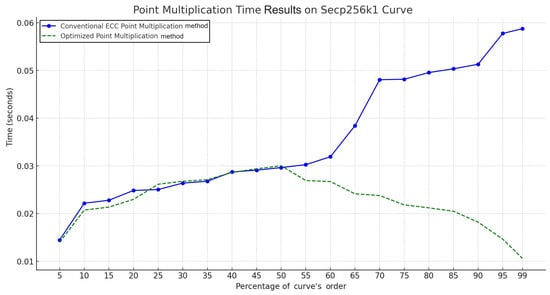 As shown in the diagram, both methods exhibit similar operation time results for scalar values up to 50% of the curve’s order. Beyond this threshold, the optimized point multiplication method demonstrates a significant reduction in operation time, indicating a decrease in computational complexity for larger scalar values.