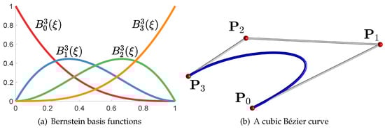 for . Figure 1a illustrates cubic Bernstein basis functions with .