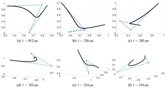 Figure 3 presents a collection of cubic Bézier curves, each defined by randomly generated control points. The first row displays two-dimensional curves, while the second row shows three-dimensional curves. As determined by Algorithm 1, these cubic Bézier curves exhibit no self-intersections. The computation time associated with each curve, as denoted next to their respective image identifiers, underscores the high computational efficiency of the proposed method.