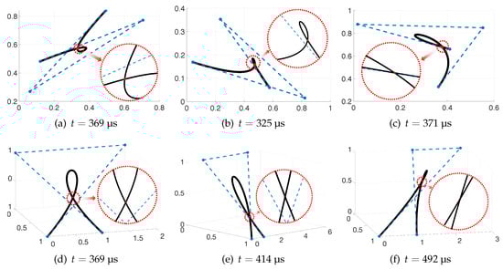 Figure 5 shows a series of cubic Bézier curves, each defined by control points generated at random. Through the application of Algorithm 1, we calculate the parameter values corresponding to the self-intersections within these curves, alongside the required computation time. For enhanced clarity, zoomed-in views of the intersection regions are provided within each figure. Table 1 presents the comprehensive computation results from this example.