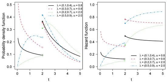 PDF (left) and hazard function (right) of the PPE distribution for different values of and , with ( partitions).