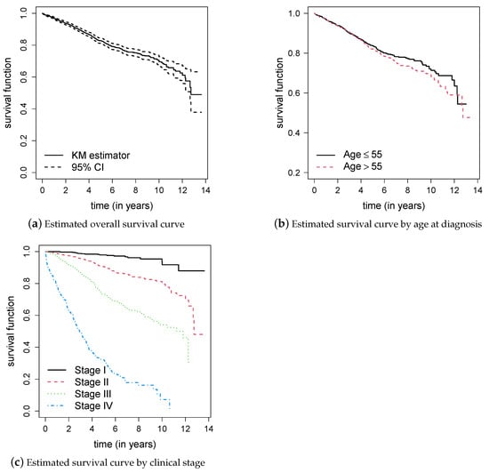 Death due to cancer was defined as the event of interest, and the time was measured from the date of diagnosis until the patient’s death (in years, mean: 5.01, standard deviation (SD): 3.05, median: 4.50, range: 0.0027–13.62). A total of 461 (18%) events occurred during the follow-up period. The median follow-up time was 12.7 years. The observed independent variables were as follows: age at diagnosis (mean: 58.98, SD: 12.64, median: 59, range: 20–94) and the clinical stage (I: 721 (28.14%), II: 976 (38.1%), III: 651 (25.41%), and IV: 214 (8.35%)), with clinical stage IV representing the most advanced stage. Figure 2 shows the estimated survival curves obtained by the Kaplan–Meier (KM) estimator for the breast cancer dataset. According to the estimated overall survival (Figure 2a), the survival function appears to trend towards a plateau close to 0.5, suggesting the presence of long-term survivors in the population. Additionally, younger patients (≤55 years old) and those in early clinical stages exhibit higher survival rates (Figure 2b,c).