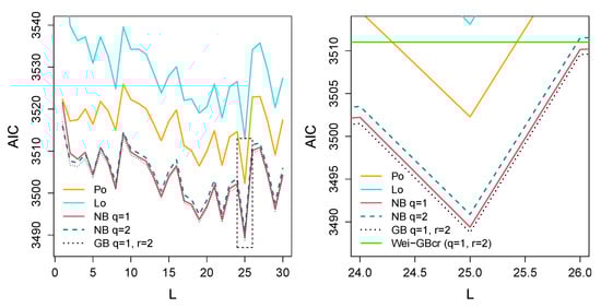 We fitted 59 particular cases of the MPScr-PPE model, considering homogeneous partitions based on the quantiles ranging L from 1 to 30. The models considered were Po, Lo, Bo, Ha, NB (with to ), Bin ( to ), RGP ( to ), and GB ( to and to ), including the most popular cure rate models in the literature mentioned in the Introduction. Figure 3 shows the Akaike information criteria (AIC) [23] for all combinations of the available covariates, considering the five models with a better performance (Po, Lo, NB with , NB with , and GB with and ). The best scenario was , with a similar trend in all the proposed adjusted models. For comparative purposes, we also considered the same models with the baseline Weibull (WEI) distribution for the concurrent causes; here, the lowest AIC was 23 points higher than our proposal.