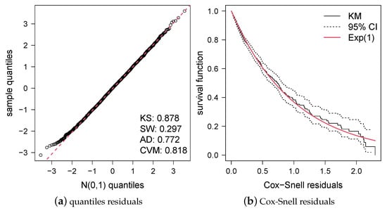 Figure 4 shows the QQ-plot for the quantile residuals (left panel) and KM estimator for the Cox–Snell residuals [25] (right panel). On the other hand, we also applied some common normality tests to check the validity of the quantile residuals, such as the Kolmogorov–Smirnov (KS, [26]), Shapiro–Wilk (SW, [27]), Anderson–Darling (AD, [28]), and Cramer–Von-Mises (CVM, [29]). The p values for such tests suggest that the quantile residuals have a standard normal distribution. Finally, the KM estimator for the Cox–Snell residuals suggest that it is reasonable that such residuals have a standard exponential distribution. For this reason, both residuals suggest that the GBcr model provides satisfactory results for this data set.