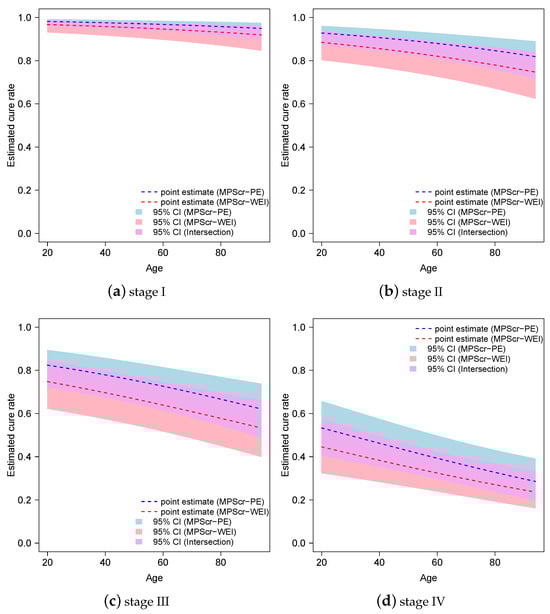 Estimated cure rate and the corresponding 95% confidence intervals for the MPScr-PE and MPScr-WEI models.