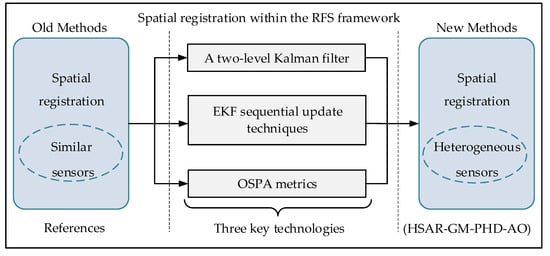 Sensor spatial registration has applications in robotics, augmented reality, target tracking, navigation, autonomous vehicles, remote sensing, and industrial automation. Extensive research has been conducted on spatial registration for multi-sensor systems [23,24,25,26,27,28,29,30,31,32,33,34,35]. Spatial registration can be broadly divided into two categories: one is based on common significant targets, which rely on known association relationships, and the other is based on the RFS framework. The spatial registration based on RFS does not require the extraction of common significant targets but can directly use multi-target information for registration, thus avoiding the impact of data association on spatial registration. In current research, the RFS-based spatial registration method has shown superior performance compared to the common significant target-based approach. Although our study focuses on the RFS framework, we will provide a detailed summary of both types of methods in the following paragraphs to ensure comprehensive analysis and comparison.