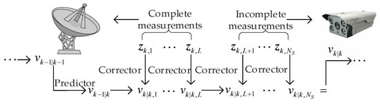 The central idea of sequential filtering for heterogeneous sensor data fusion, as shown in Figure 3, is to first update the target state using complete measurements (such as active radar measurements). The filtered state estimate obtained from the complete measurements is then used to replace the value of state estimation for incomplete measurements (such as infrared measurements). Similarly, the filtered state estimation covariance obtained from the complete measurements is used to replace the updated value of state estimation covariance for incomplete measurement sensors. Subsequently, the target state is updated using the incomplete measurements, and the updated results serve as the global filtering state estimate and state estimation covariance . The pseudocode for heterogeneous sensor registration using EKF sequential filtering is provided in Algorithm 2.